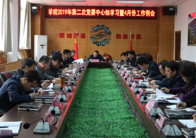 4月2日下午,我院召开2019年第二次党委中心组学习暨四月份工作例会,集中学习传达中央及省厅中职教育座谈会等重要会议精神,重点学习习近平总书记在思想政治理论课教师座谈会上的讲话,传达教育厅“扫黑除恶”推进会精神及要求,通报3月份工作开展及督办情况,安排部署4月份工作。会议由院长杜建忠主持。