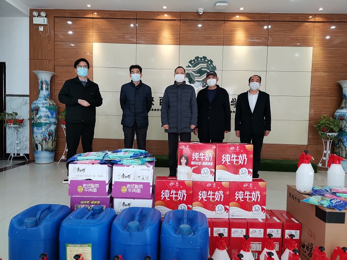 此次捐赠84消毒液4桶200斤、消杀喷壶20个、防护手套20个、桶装方便面6箱、牛奶13箱。杜院长代表全院师生对项目部助力学院疫情防控,心系教育、回馈社会、爱心捐赠的善举表示敬意和感谢!他表示:捐赠的这批疫情防控物资有效地缓解了我院目前防护物资短缺状况,学院将悉数用于开学后的疫情防控工作。