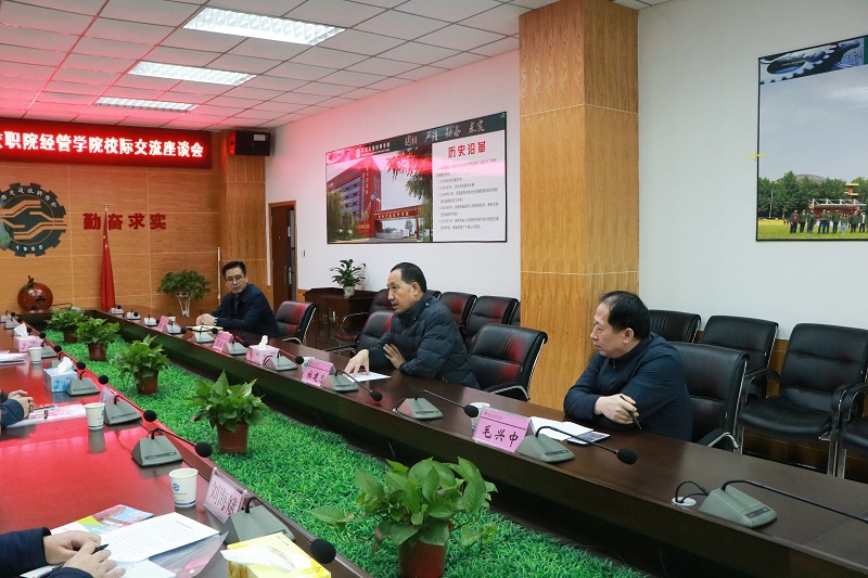 座谈会上,杜建忠院长首先对陈院长一行表示热烈欢迎,并简要介绍了我院发展历史、专业建设、师资力量、人才培养、教学管理、社会培训和招生就业等方面的情况。在听取我院情况介绍后,陈军川院长对我院的热情接待表示感谢,对学院党建工作、创建高水平示范校建设及各方面发展取得的成果给予了高度评价。陈军川院长简要介绍了经管学院的基本情况,并希望今后双方在专业建设、学生管理工作中多找结合点,深度推进两校合作。双方重点就电子商务专业、物流专业合作进行了深入沟通和探讨。