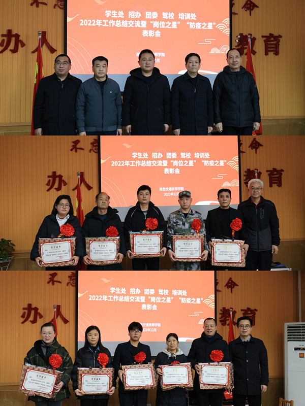 2022年是个极度不平凡的一年,新冠肺炎疫情全国多点、多频爆发,社会层面疫情防控工作形势严峻复杂,给学校的疫惰防控、学生管理、培训工作带来巨大难度和压力。学院招生宣传工作全员参与、多措并举,招生工作成绩斐然创历史新高。为了更好地总结年度各项工作,激励全体学管、培训职工士气,认真贯彻落实杜建忠院长对学生管理和培训工作的指示精神,进一步研讨2023年的工作创新发展之路,促进学院高质量发展,12月8日,学生处招办团委、驾校培训处召开2022年工作总结交流暨“岗位之星”、“防疫之星”表彰会。院党委书记院长杜建忠、党委委员副院长董鹏、院党办主任侯玉印应邀出席并作指导讲话;院学生管理、培训部门全体干部职工参加,会议由刘锋伟主持。