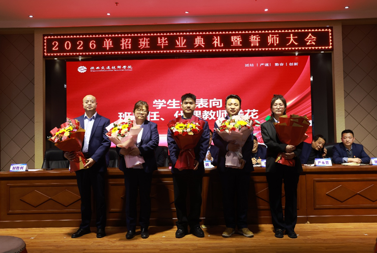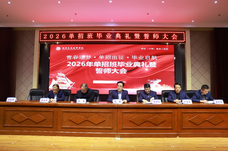 3月10日下午,我院2026年单招班毕业典礼暨誓师大会在学术报告厅隆重举行。本次大会以“青春逐梦•单招出征•毕业启航”为主题,党委委员、副院长董鹏,党委委员、副院长张勇,党委委员、院长助理李剑平,汽车系主任孙文平,教务处副处长严永哲,公路系副主任唐军伟出席大会,与毕业班全体师生及部分家长代表共同见证这一庄严时刻。大会由学生处处长封胜利主持。