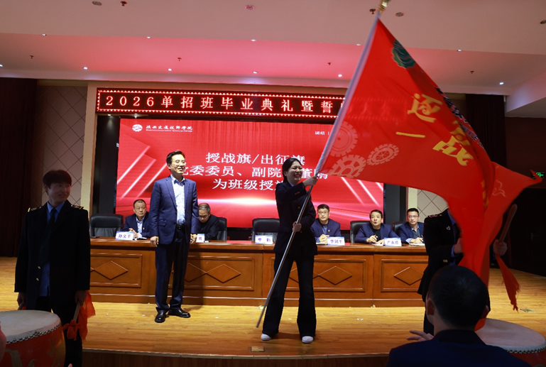在单招誓师篇章中,党委委员、院长助理李剑平作单招动员讲话,勉励学子坚定信心、全力备考。相奥楠带领全体毕业生庄严宣誓,铿锵誓言彰显了学子们迎战单招、决胜未来的坚定信念。党委委员、副院长董鹏为班级授出征旗,鲜红的旗帜象征着责任与使命的传递。