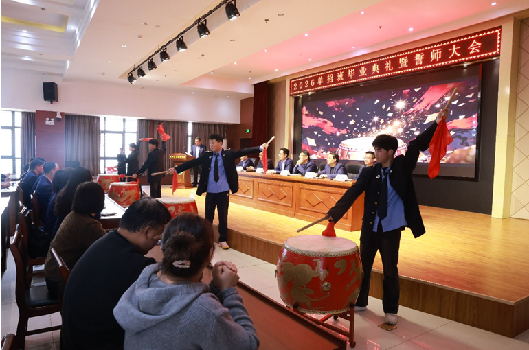 仪式尾声,现场擂响出征战鼓,为学子助威壮行。全体师生齐唱校歌,在激昂的旋律中,2026年单招班毕业典礼暨誓师大会圆满落幕。