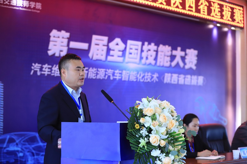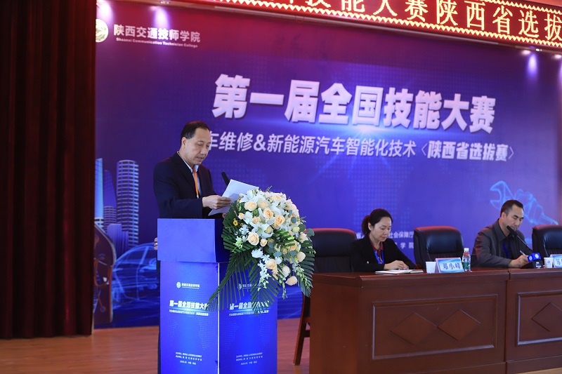 大赛执委会主任、陕西交通技师学院党委书记、院长杜建忠在开幕式上致辞。他首先代表陕西交通技师学院全体师生对参加开幕式的专家、裁判和选手表示热烈的欢迎。杜院长在讲话中感谢上级单位长期以来对学院发展的鼎力支持。他表示,两个国赛项目的全省选拔赛在我院举行,充分体现了上级部门对我院技能人才培养工作的肯定, 也是对我院办学办赛实力的一次大检阅,更为我们提供了一个向兄弟院校学习交流的好机会,必将极大地促进我院技能人才培养工作,对我省职业院校对接国家技能大赛标准,深化教育教学改革,增强办学实力和竞争力起到积极的推动作用。同时,学院将全力以赴,做好竞赛的后勤保障工作,以优质的服务,确保选赛的圆满成功。最后, 杜建忠院长预祝第一届全国技能大赛汽车维修、新能源汽车智能化技术陕西选拔赛圆满成功,并预祝各位选手取得优异成绩。