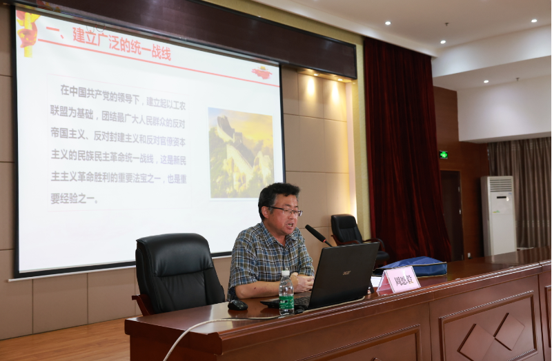 周恩毅教授以《中国共产党领导新民主主义革命胜利的历史经验及其启示》为题,旁征博引、深入浅出,深刻阐述我们党在中国革命中战胜敌人的三个法宝:统一战线、武装斗争、党的建设。周教授的宣讲,内容丰富、精彩生动、充满激情,让全院党员、教职工对中国共产党克敌制胜的三大法宝有了更深入、更透彻的理解。全体党员干部教职工认真听讲,详细记录。