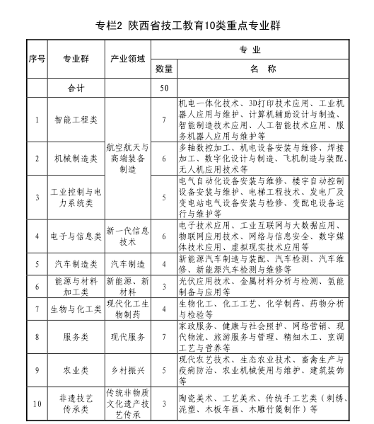 2.打造陕西技工新品牌。围绕我省6大支柱14个重点产业领域,聚焦省级23条制造业产业链,打造航空航天、能源化工、汽车制造等高精尖缺新技工;聚焦省级7条文化旅游业产业链,打造旅游服务、现代物流、网络营销等现代服务新技工;聚焦省级9条现代农业产业链,打造现代农艺、生态农业技术、农业机械使用维护等乡村振兴新技工,建设10类重点专业群50个以上品牌专业。大力开展职业技能培训,打造旬阳建工、蓝田厨师、紫阳修脚师等一批劳务品牌,服务支撑经济高质量发展。