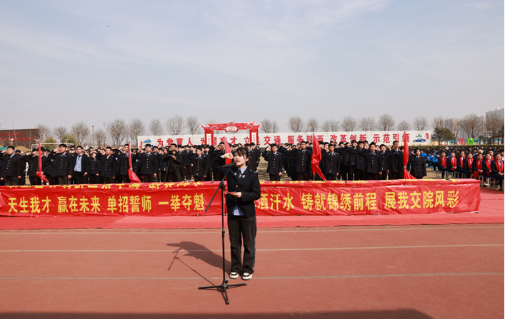 大会伊始,在奋进激情的乐曲声和铿锵有力的锣鼓声中,学院党委书记、院长杜建忠带领班子成员和任课教师列队齐整、夹道欢迎单招毕业班学生依次穿过“龙门”。全场士气高昂、群情振奋,不时爆发出阵阵热烈掌声。