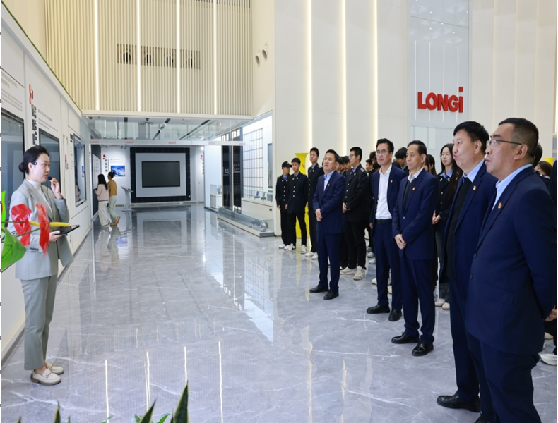 随后,研学团队转场至隆基乐叶光伏科技(西咸新区)有限公司。作为全球领先的光伏企业,隆基乐叶西咸基地是隆基绿能目前规模最大、自动化程度最高、设备工艺最先进的太阳能电池生产基地。在公司展厅,师生们通过实物展示和视频介绍,深入了解了企业发展历程、技术创新成果及产业布局。