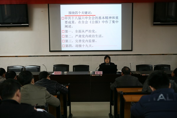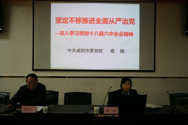 为全面提高学习贯彻十八届六中全会精神水平,引导广大党员干部职工深刻领会、系统把握全面从严治党要求,进一步牢固树立“四个意识”,增强做合格党员的思想自觉和行动自觉。12月21日,陕西交通技师学院党委特邀中共咸阳市委党校党史党建教研室主任,咸阳市党的十八届六中全会精神宣讲团成员穆娟教授为全体党员职工做专题讲座。