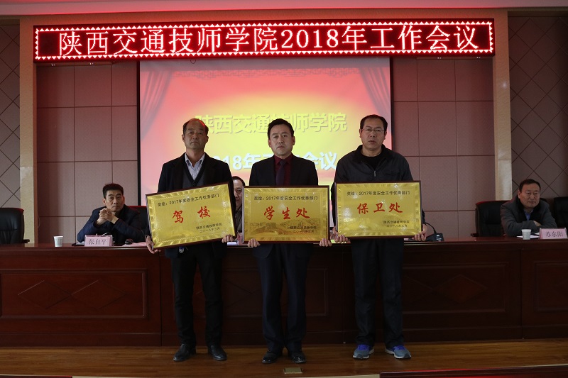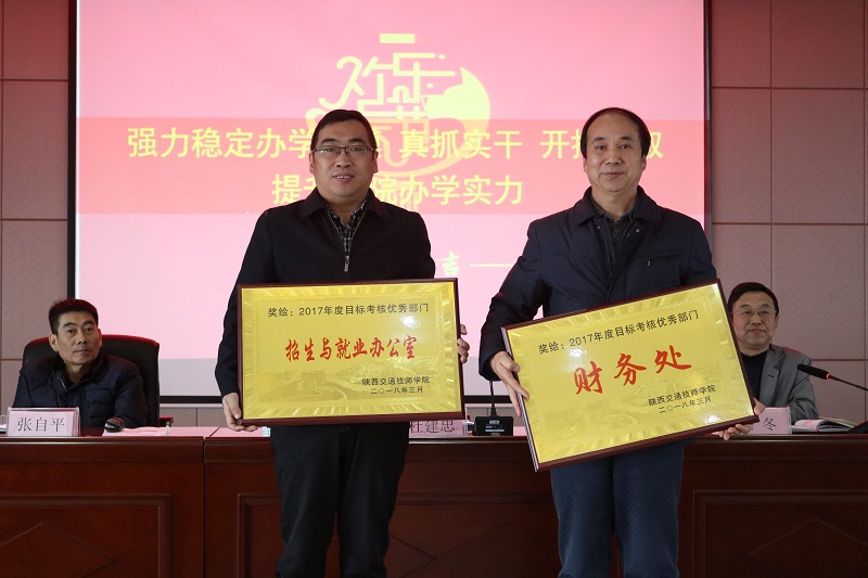 会上,副院长张自平、苏东阳分别传达了省教育厅2018年度工作要点和全省交通工作会议精神。纪委书记张世西、工会主席孟祥斌依次通报了学院2017年度目标考核和安全工作考核情况。副院长毛兴中就2018年招生工作做了全面部署并作动员讲话。会上还对2017年目标考核和安全工作考核优秀部门以及优秀职工进行了表彰。