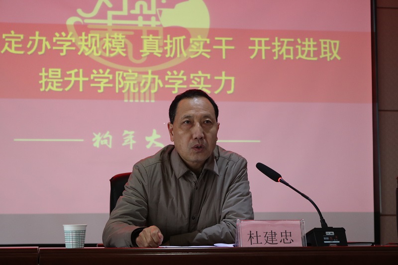 会上,院长杜建忠简要回顾了寒假期间重点工作,他结合学院发展就提升学院软实力、教师队伍建设、特色办学、让质量提升项目成果落地生根,以党建促发展,建设特色环保平安校园,做好培训工作、加强管理等九个方面对2018年重点工作目标任务进行了部署。他还结合职业教育发展形势分析了学院面临的机遇和挑战,并就招生工作,转变观念,抓住扶优扶强政策,加强学院管理,做好精准扶贫,搞好教学改革等六个方面提出新的工作要求。他指出学院要进一步把思想和行动统一到新时代中国特色社会主义行业导向下职业教育发展的重大决策部署上来,职工要牢固树立看齐意识,提高认识、打破瓶颈,全力以赴、狠抓落实,为谱写学院发展新篇章和开启学院2018年新征程而努力奋斗。