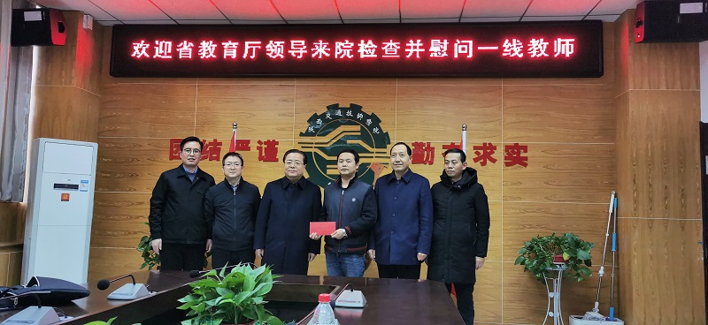 2月2日上午,在2021年新春佳节来临之际,省委教育工委委员、省教育厅副厅长王海波带领教师工作处处长王彬武、教师工作处四级调研员王小峰一行莅临我院,看望慰问我院一线优秀教师代表靳王宾。向他致以节日的问候和美好祝愿,送上了慰问金和慰问品,并向我院辛勤耕耘、无私奉献的广大教师和教育工作者致以新春的问候和诚挚的祝福。学院党委书记、院长杜建忠、工会主席孟祥斌、院长助理董鹏等陪同参加活动。