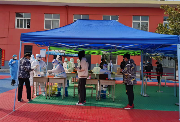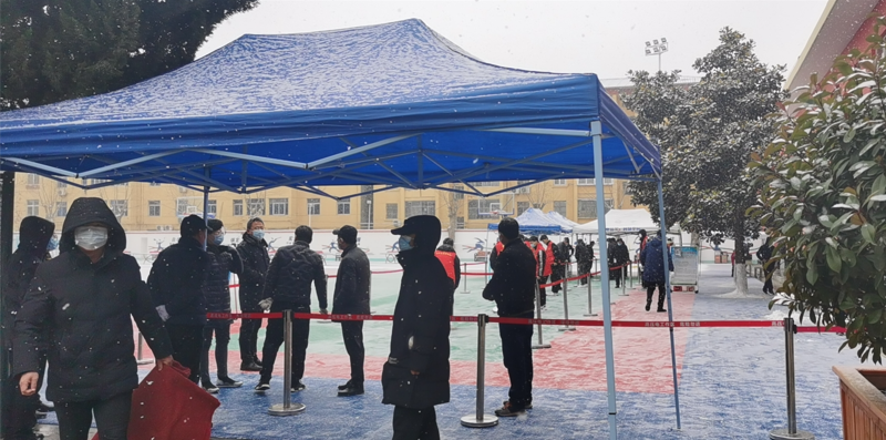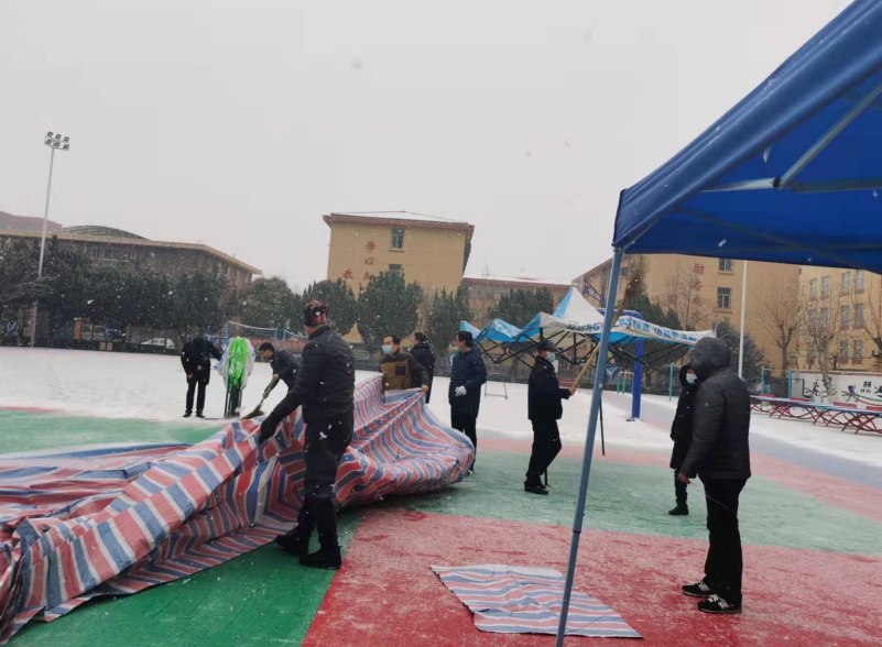 尤其是在12月25日,突然下雪,广大党员干部冒着凛冽地风雪与学生志愿者一起搭建核酸检测场地,扫雪、搭建工作棚、布置设备,网络、线路。经过3个小时的突击,全院师生顺利完成了第5轮核酸检测工作。