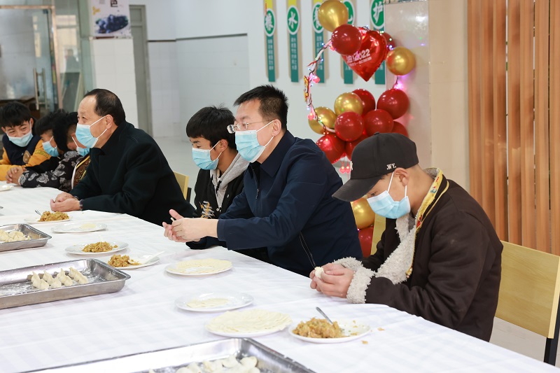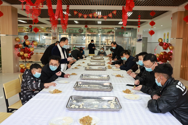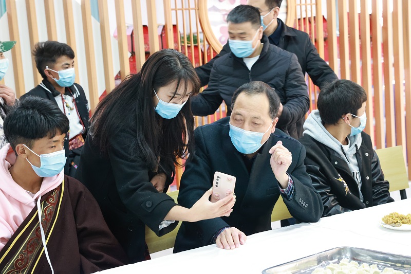 “同学们,过年好,给大家拜年啦!”井厅长一行来到餐厅向正在包饺子的同学们致以新春的问候和祝福,并和同学们一起包饺子、话家常,其乐融融。期间,同学们还视频连线远在西藏阿里的父母与各位领导、老师相互问好,亲切交流,现场笑声不断,欢乐祥和。