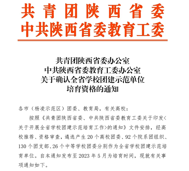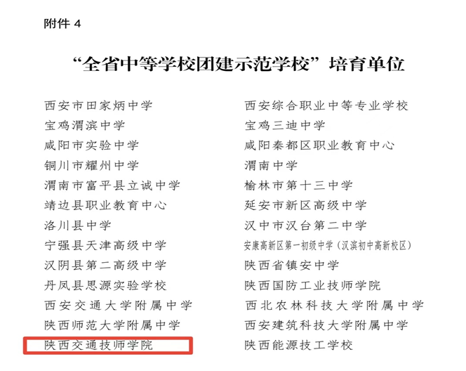 近日,共青团陕西省委、中共陕西省委教育工委联合印发了《关于确认全省学校团建示范单位培育资格的通知》,经高校推荐、资格审查,在全省遴选产生20个高校团委、91个院系团组织、130个团支部、26个中等学校团委分别作为全省学校团建示范培育单位。陕西交通技师学院入选“全省中等学校团建示范学校”培育单位。培育时间为2022年7月至2023年5月。