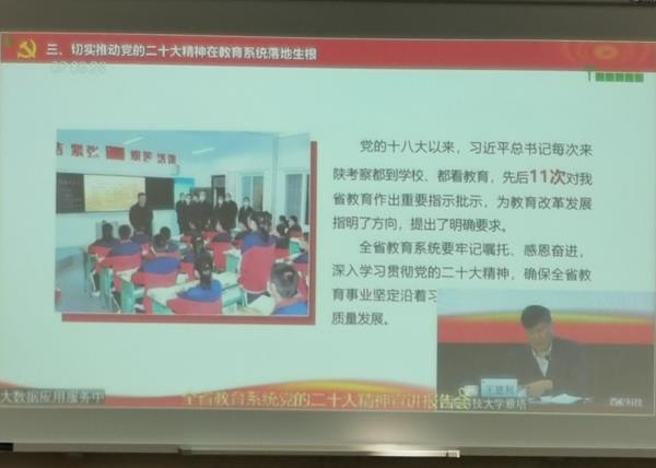 11月14日,省委宣讲团成员、省委教育工委书记王建利同志为全省教育系统作党的二十大精神宣讲报告。我院党委书记、院长杜建忠,全体党委委员、各党支部书记、党委办公室人员,在学院分会场参会学习。