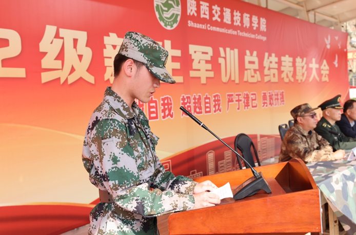 优秀军训学员代表陈逸轩代表军训学员在发言中分享了军训心得,他表示军训是一个成长的阶梯,是一段难忘的生活,是一个崭新的课堂。军训固然很苦,却是一种体验人生、战胜自我,磨练意志的最佳契机。自己将把军训中学习到的团结互助、自立自强精神带到今后的学习生活中,以高标准严格要求自己,在陕交院这个大家庭里,在未来社会的大舞台上,努力实现自身的最大价值,创造精彩辉煌的人生!