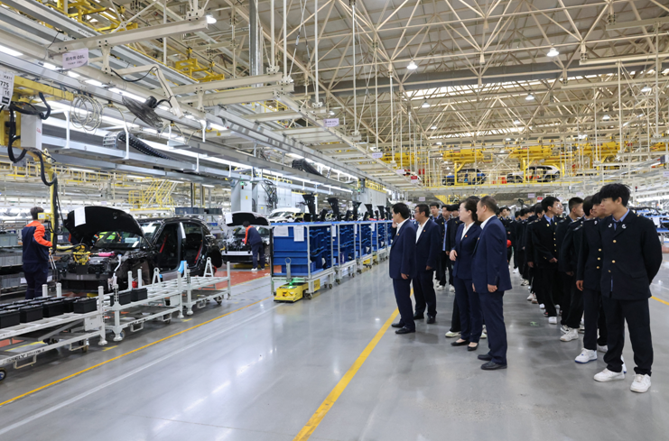 吉利汽车西安制造基地作为全球首个全架构、全能源、全车系智能“黑灯工厂”,集数字化、自动化、智能化、柔性化为一体,是目前吉利汽车占地面积最大、投资最多、产品最高端、工艺最先进、智能化程度最高的整车生产基地和4.0工厂,生产线及制造体系的建设完全满足欧盟标准。在吉利汽车人力资源部相关负责人的带领下,师生们一走进智能化冲压车间,映入眼帘的全是智能机器人操作、全过程智能监控、智能化“运输连廊”流水线生产设备,同学们无不为之感到震撼;来到全自动化焊装车间,一排排工业机器人正进行着精准焊接,火花四溅,工业之美展现的淋漓尽致;进入到全面实现无人喷涂的涂装车间,现代工艺的精妙绝伦令人折服;在集数字化、自动化、智能化为一体的总装车间,同学们切身感受了整车下线的壮观场面。