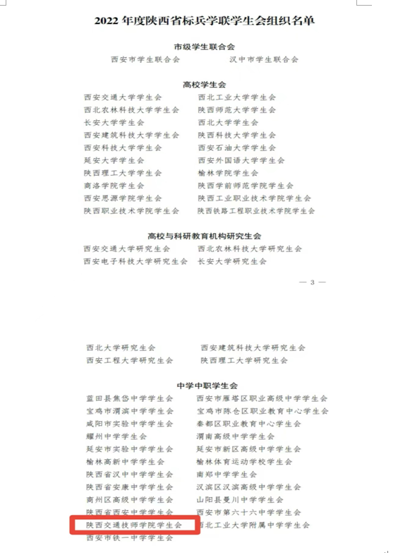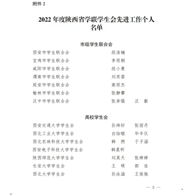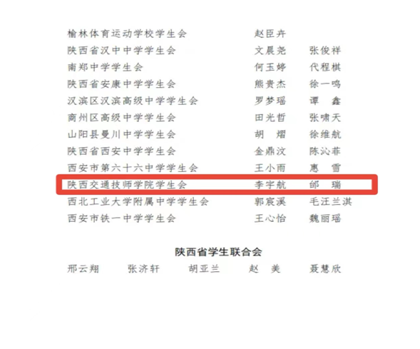 近日,陕西省学生联合会下发《关于2022年度陕西省标兵学联学生会组织、陕西省学联学生会先进工作个人的通报》,我院学生会荣获“2022年度陕西省标兵学联学生会组织”荣誉称号,学生会李宇航、邰瑞两名同学被评为“2022年度陕西省学联学生会先进工作个人”。