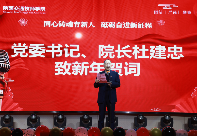 学院党委书记院长杜建忠致辞,代表学院党政,向关心支持学院发展的各级领导、兄弟院校、广大校友和各界朋友,向辛勤奉献的教职工及家属,向为学院发展做出贡献的退休老同志,向立志成才的学子们,致以诚挚的问候和新年的祝福!