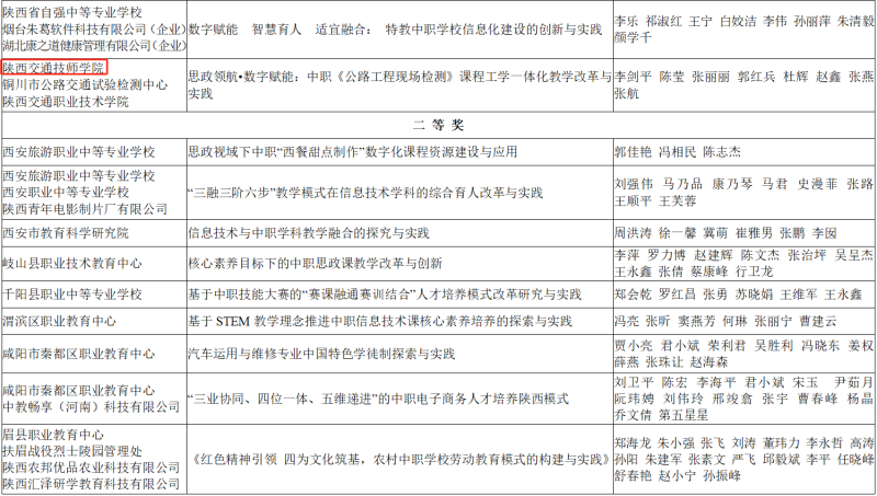 陕西省教育厅、陕西省人力资源和社会保障厅下发《关于公布陕西省基础教育、中等职业教育教学成果奖评审结果的通知》,我院李剑平、陈莹、杜辉、赵鑫申报的《思政领航·数字赋能:中职<公路工程现场检测>课程工学一体化教学改革与实践》荣获陕西省第四届中等职业教育教学成果奖一等奖,系全省唯一获得此项殊荣的技工院校。