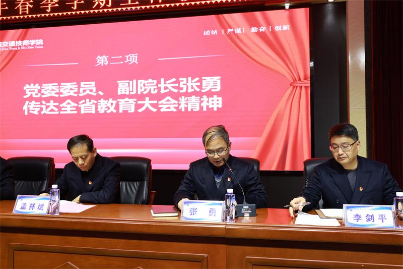 党委委员、副院长张勇传达了全省教育大会精神,强调学院将紧扣国家战略,深化产教融合,优化专业布局,构建高质量技能人才培养体系,为服务区域经济发展贡献职教力量。
