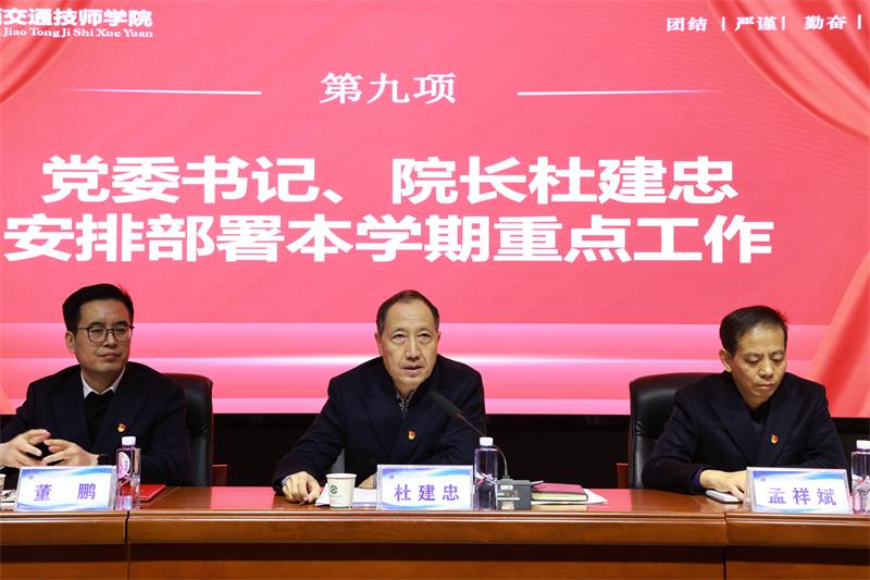 杜建忠从“强化党建引领、提升支部工作,创新招生工作、提高生源质量,实施铸魂强师工程、打造高素质队伍,坚持岗课赛证融通、强化专业建设,加强制度建设、提升管理水平,织密安全网、提升后勤服务,加强学生管理、培育校园文化,统筹校庆工作、激发干事热情,抓好廉政建设、营造良好氛围,开源节流、提升师生幸福感”等十个方面对学院2025年春季学期工作进行全面安排部署。