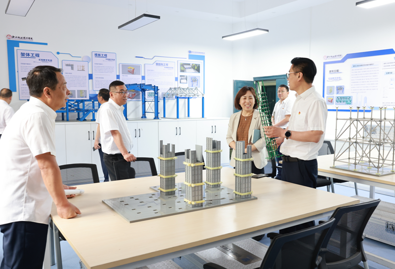 在西安职业技术学院建筑与轨道交通学院副院长赵洁的陪同下,我院副院长董鹏一行参观了西职院校企共建的产教融合实训基地,包括装配式建筑智慧建造实训基地、BIM实训室、城轨运营沙盘实训室等。赵洁详细介绍了实训基地的建设经验,特别是与西安市市政建设集团合作打造的“智慧建造产教融合实训基地”运行情况。该基地总投资2000万元,集教学、科研、培训于一体,年均接纳1500余名学生开展实践,并承担企业技术培训任务,实现了“产业链”与“教学链”的精准对接。