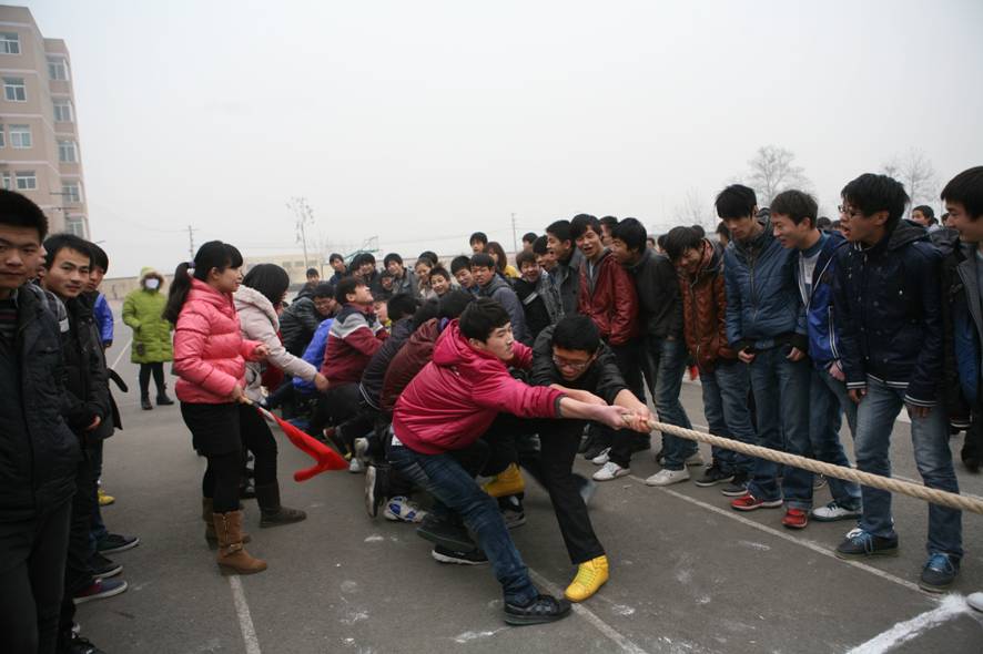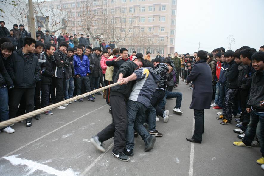 在20日和21日下午4点,学院教务处在大操场举办了“迎新年•庆元旦”男子拔河比赛,本次参加比赛的有19个班级。比赛中,裁判员一声令下,所有的人都严肃起来,一齐抓紧绳子。“嘟—”开始了,绳子中间的红布条一会儿左,一会儿右……双方都紧紧的握着绳子坚持不放手,脸涨的通红,所有人劲往一处使,只有一个目标,就是要赢!“加油!加油!加油!加油!加油!加油!”“哈,哈,哈……我们赢了,我们赢了,哦耶!”的声音在校园上空飘荡……