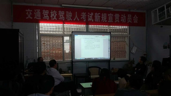 会议由驾校教研组长屈云峰主持。业务主管谢玉敏传达了副省长杜航伟在全省驾考工作推进会上的讲话,组织学习了咸阳交警支队驾考新规宣贯会精神,并就我校驾培业务工作提出要求;驾校高级讲师冯西胜现场讲解演示了驾考新规的视频资料,尤其是驾考新规中理论考试模拟实景、调整增加文明驾驶常识内容、考试操作项目中增加“回头观察”动作、增加了时间限制、突出实用性等进行了系统介绍;总教练董小健就C2自动挡汽车使用常识和培训安全驾驶等进行了培训辅导。驾校校长刘锋伟就当前国家驾考改革形势和驾考新规作了进一步的动员,特别是对新形势下加强对驾培政策的学习理解、规范教学、安全行车、服务学员等问题,代表驾校提出要求和郑重承诺。