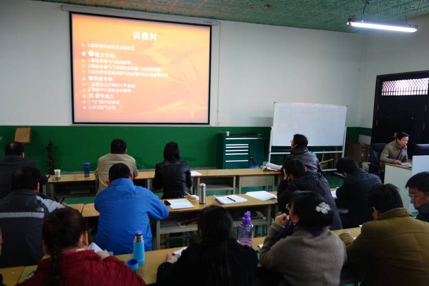 为了研究、探索职业教育的新课型,符合职业教育的新教法,挖掘理论教学与实践教学的特色。根据陕西交通技师学院汽车专业教师教学能力培训考核活动方案,我系于2014年12月17日下午在发动机实训室进行教师说课活动。