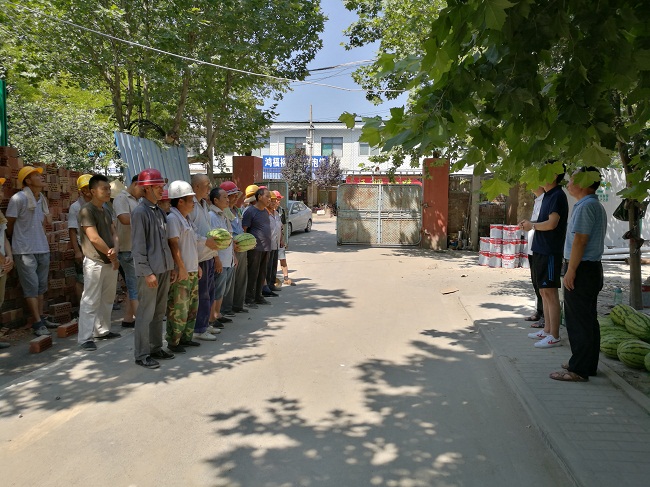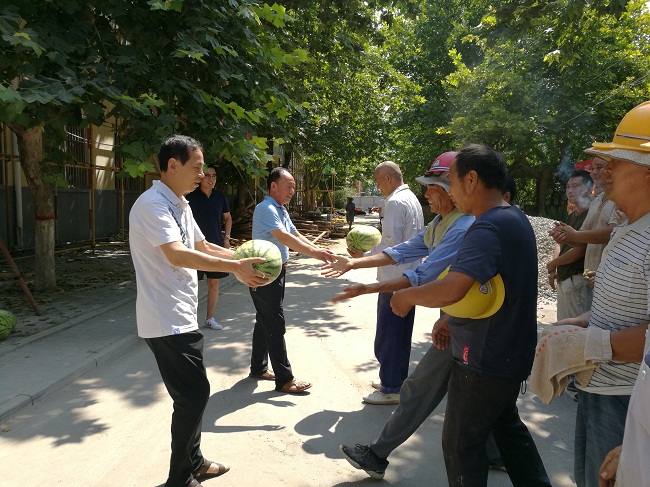 近日,天气持续高温,骄阳似火,酷暑难耐。8月2日上午,学院纪委书记张世西、工会主席孟祥斌代表学院先后来到第一教学楼、第二教学楼、电教室、球类运动场、供暖管道改造施工现场,看望慰问奋战在高温一线的施工人员,为他们送去了学院的关怀和夏日的清凉。