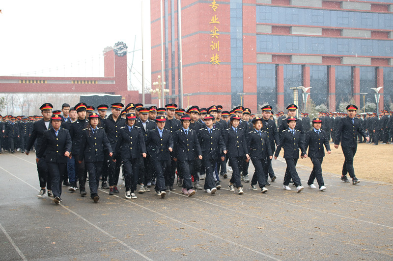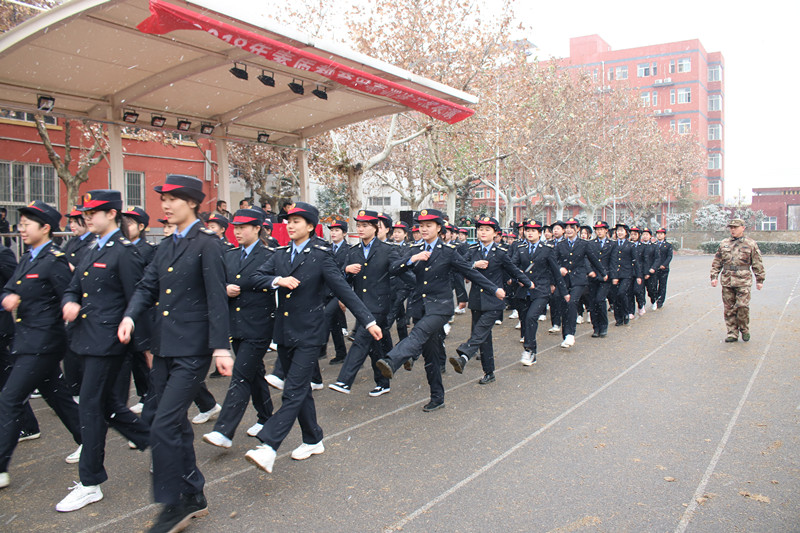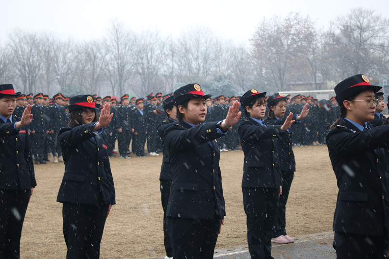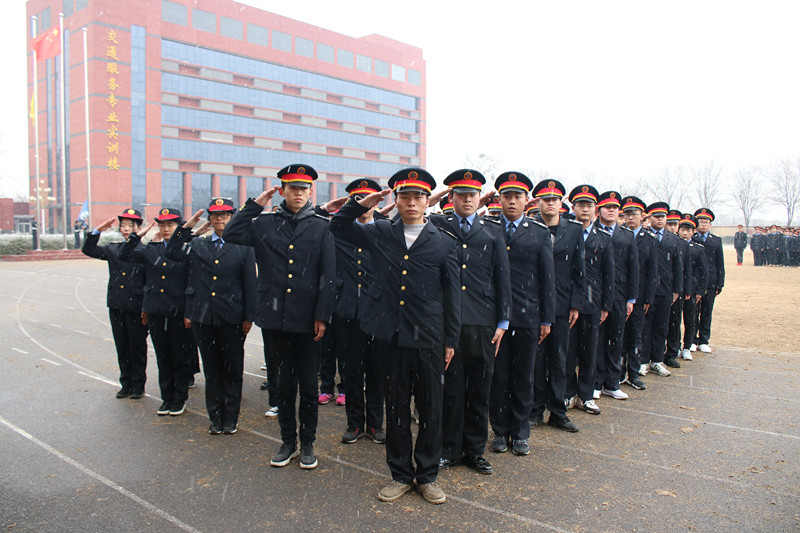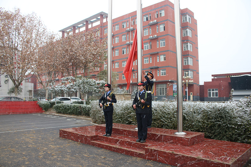 在雄壮的国歌声中,五星红旗迎着纷纷飘扬的雪花冉冉升起。同学们身着统一的标志服,精神饱满,迈着整齐的步伐向主席台缓缓走来,他们昂首挺胸,摆臂有力。在军事教官的口令下,三个班级依次展示队列表演及交通指挥手势表演,赢得了现场领导及观众的阵阵掌声。