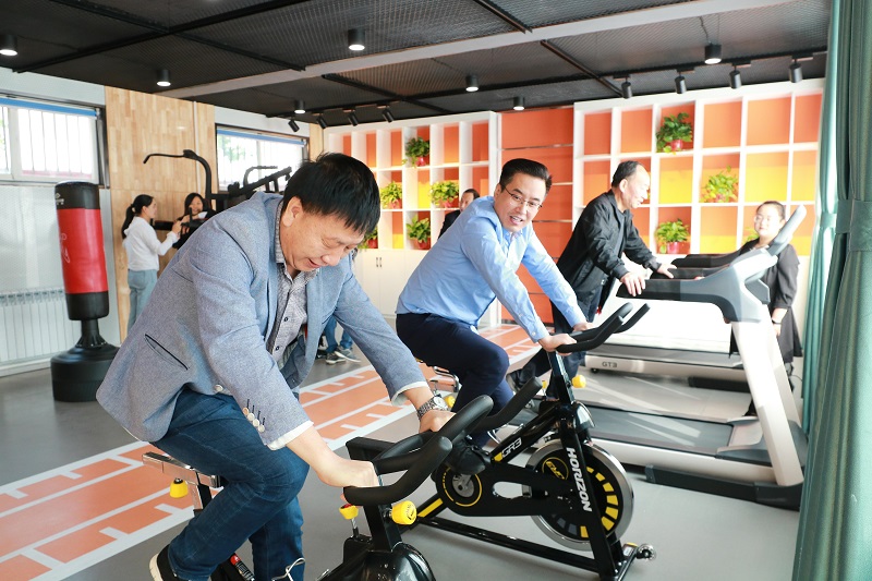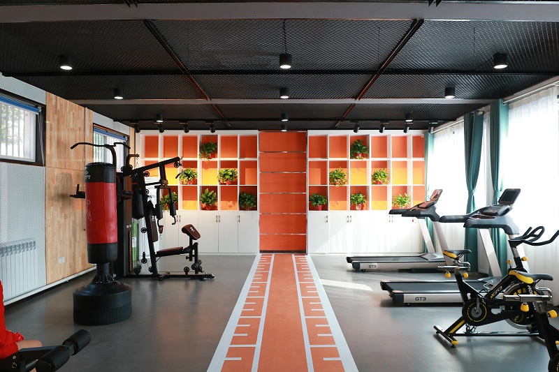 教师活动室环境时尚优雅,内有跑步机、动感单车、自由器械、组合器械、瑜伽练习区、水吧等。生活要小康,身体要健康,健康的体魄是开展教育教学工作的前提。活动室为教师创造了更好的健身活动场所,进一步丰富了教师体育锻炼活动,为教师工作之余提供了一个放松身心、舒缓压力、锻炼身体的平台。
