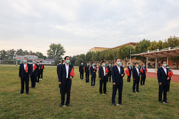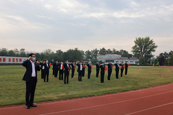 在中华人民共和国成立73周年来临之际和党的二十大即将召开的重要时刻,按照省委教育工委和学院党委的工作安排及具体要求,9月30日,学生处党支部和驾校党支部在学院大操场联合举办“庆国庆、喜迎二十大”主题党日活动。学院党委书记、院长杜建忠、党委委员、工会主席孟祥斌、党委委员、副院长董鹏及机关党支部和教务处党支部书记刘玉年、张润溪等莅临并指导活动,两个支部的全体党员和学生处支部的青年学生代表、入党积极分子等30余人参加。