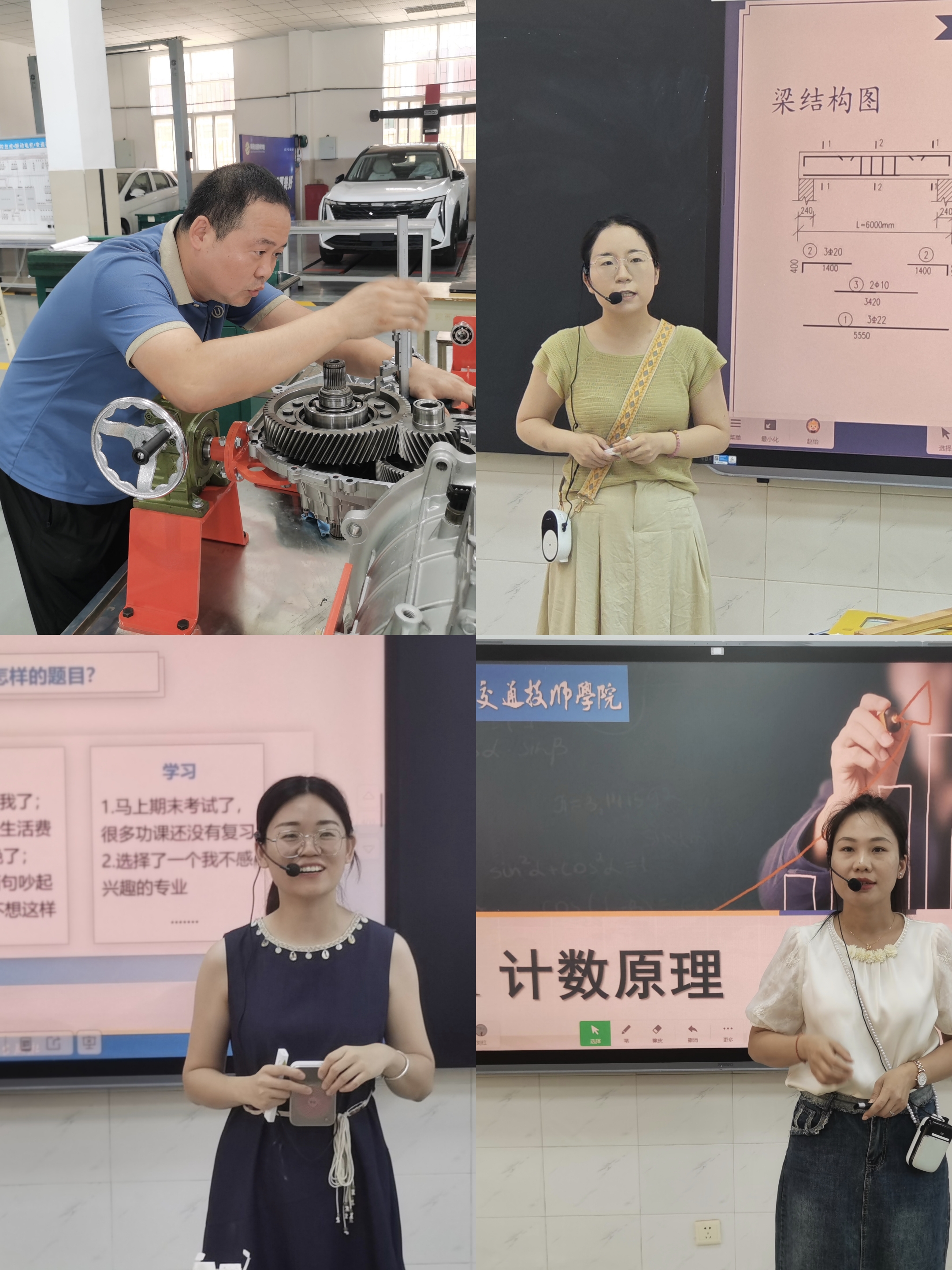 来自各教学系部的四位主讲教师进行了精彩的课堂展示。吕金玲老师在知识传授中巧妙融入价值观建设,为我们展现了生动的思政课堂;刘红老师逻辑严谨、深入浅出地给我们讲解了数学的《计数原理》;汽车系靳王宾老师以扎实的专业功底展现了他的一体化教学过程;公路系赵怡老师则呈现了富有专业特色的课堂教学。