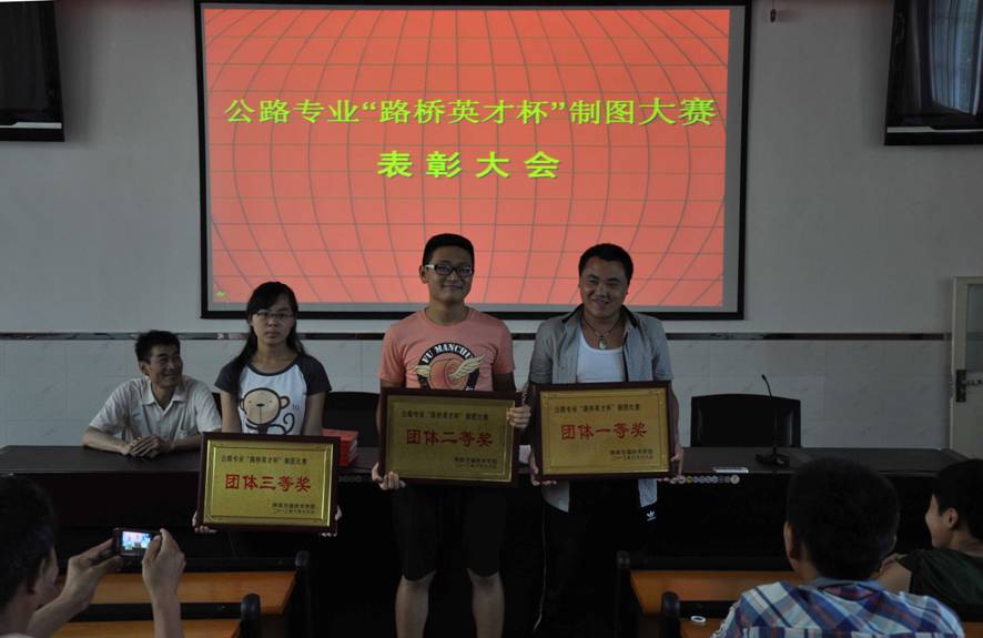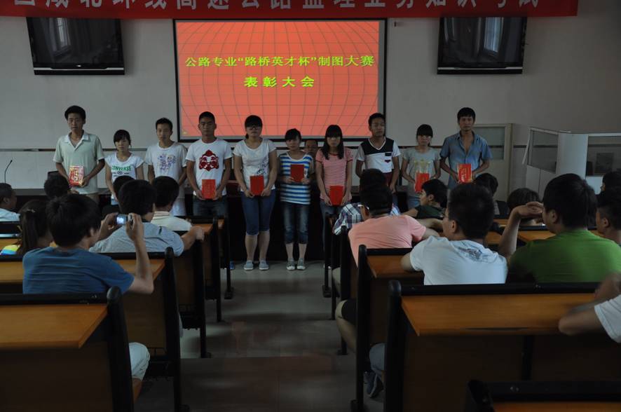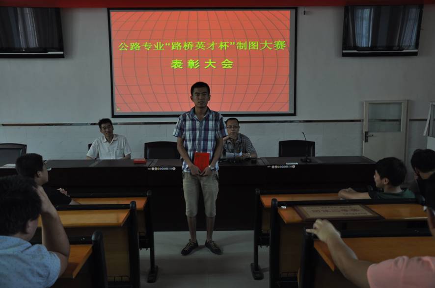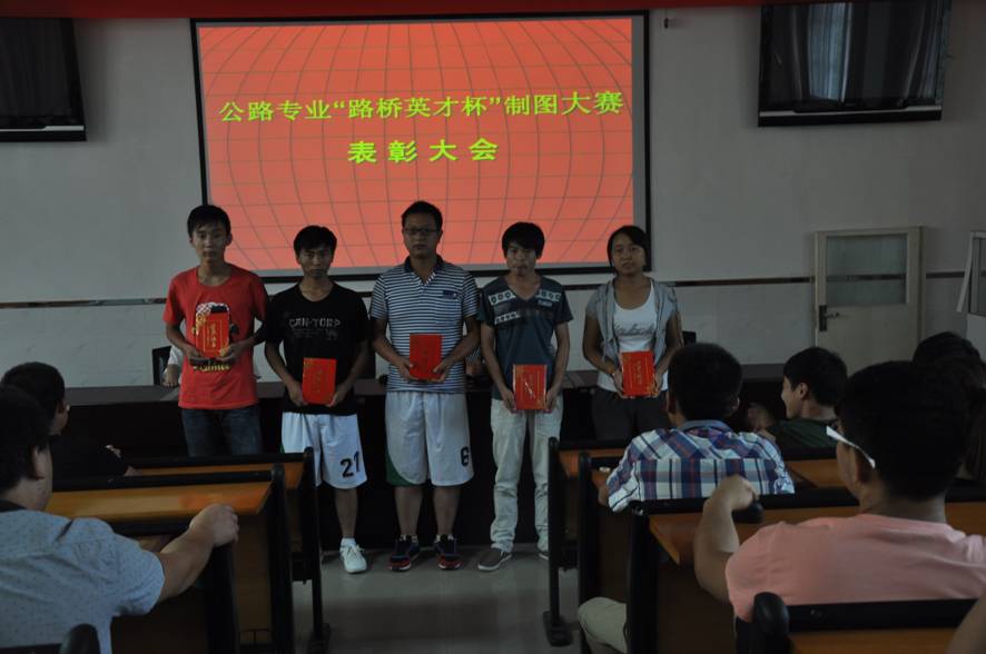 六月二十日下午,公路系在学院西阶梯教室召开了公路专业“路桥英才杯”制图比赛颁奖大会。学院张院长出席大会并为取得优异成绩的十九名同学颁发荣誉证书。本次比赛,公路专业所有班级能够积极参与,共计收到作品一百五十六份。在参赛学生中有一人获得一等奖,三人获得二等奖,五人获得三等奖,十人获得优秀奖。通过本次比赛提高了广大学生动手制图能力,形成了较好的学习氛围。